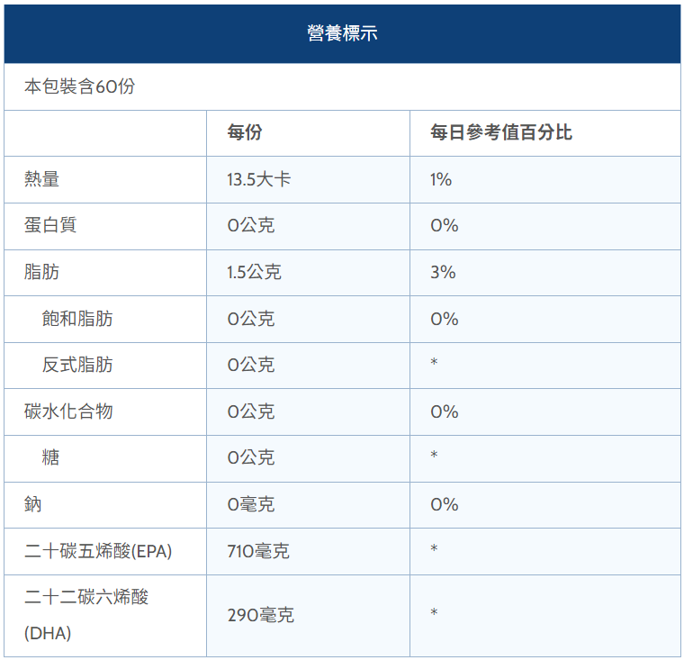 每顆膠囊提供1000毫克omega-3:EPA 710 mg和DHA 290 mg。高濃度劑量設計,可減少食用顆數。