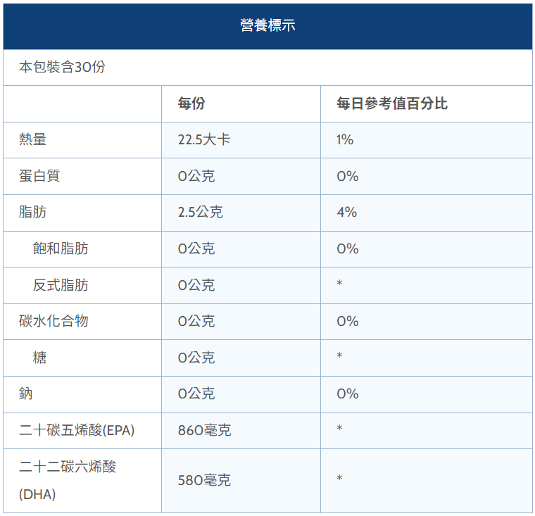 每顆膠囊提供720 mg omega-3:EPA 430 mg和DHA 290 mg。高濃度劑量設計,可減少食用顆數